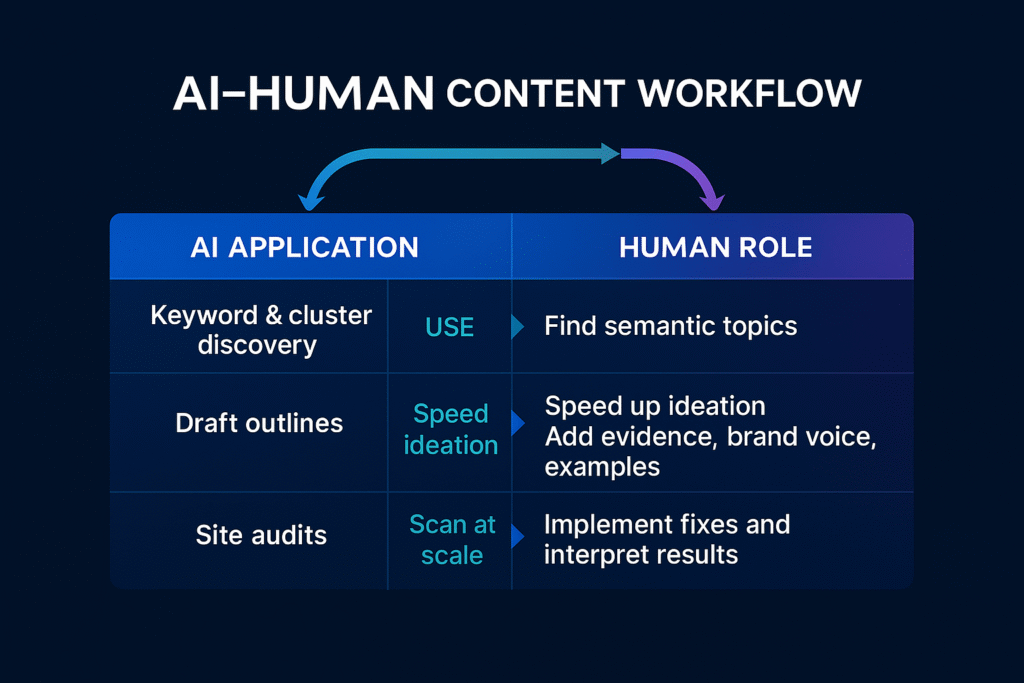 Never publish AI-generated content without substantial human review and enhancement. Google’s algorithms are increasingly sophisticated at detecting low-value automated content. Your competitive advantage comes from: