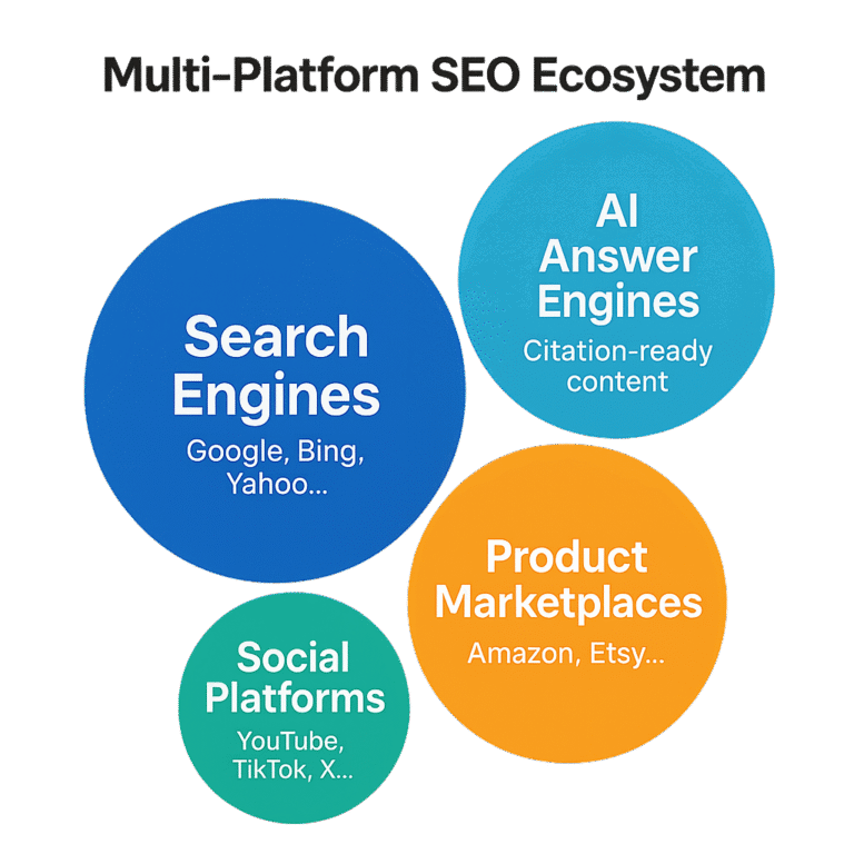 • Platform Diversification: Extend beyond Google to YouTube, social platforms, and emerging search channels